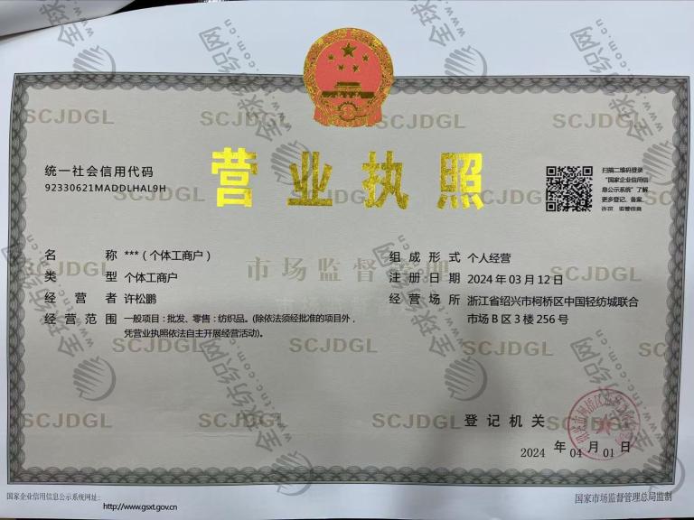 浙江省绍兴市柯桥区中国轻纺城联合市场B区3楼256号